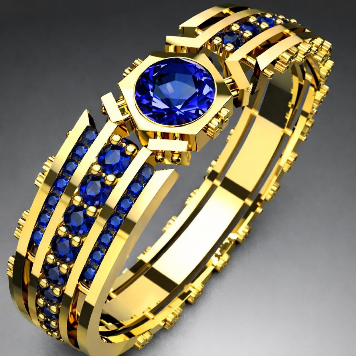 High-quality 3D model of a luxury gold ring with blue gemstones.
