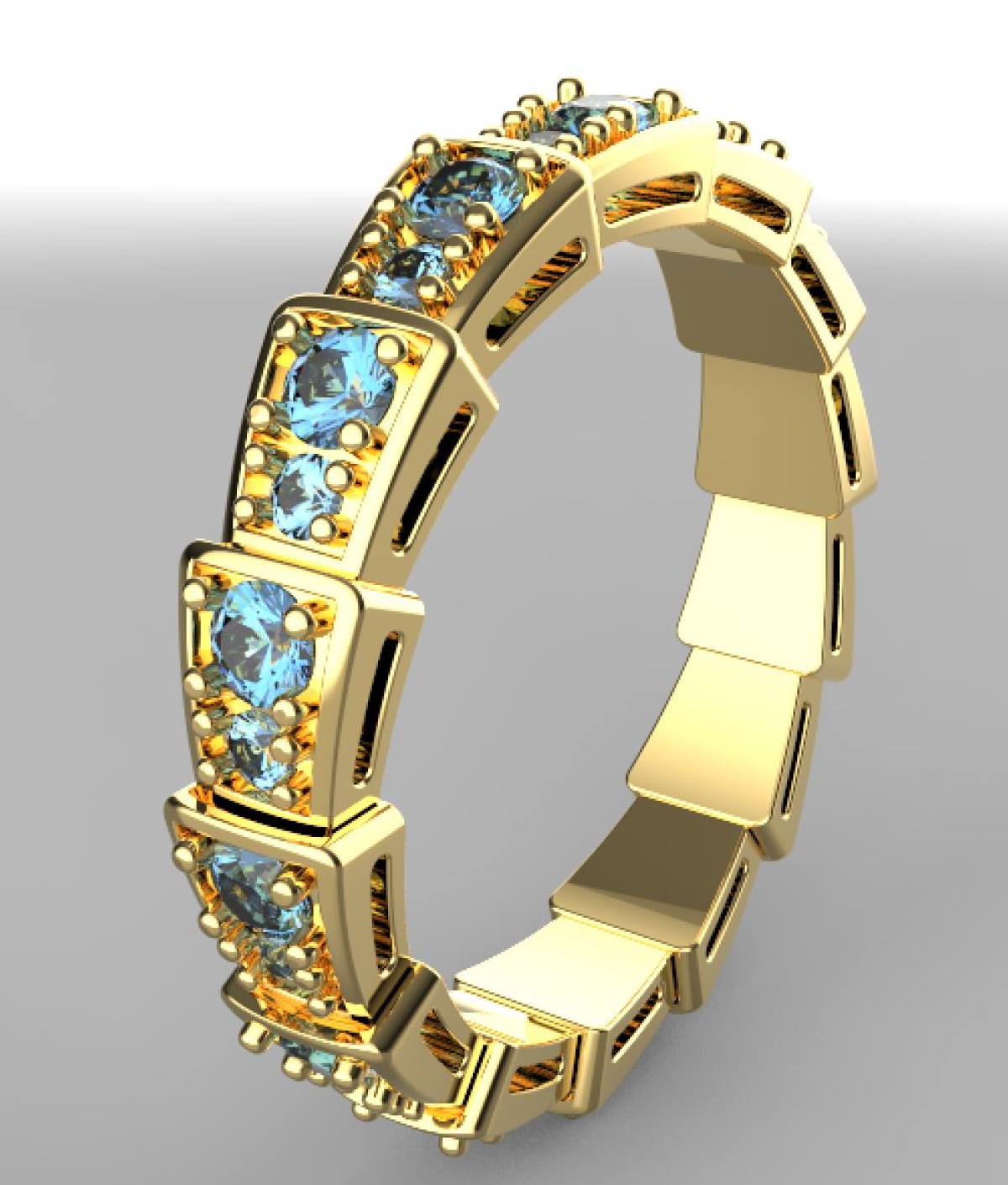 This elegant eternity ring features a modern segmented design with round blue gemstones securely set in polished gold frames. Each stone is evenly spaced and held with precise prongs to ensure durability and brilliance.
