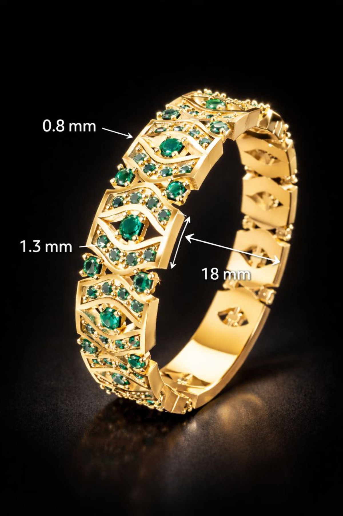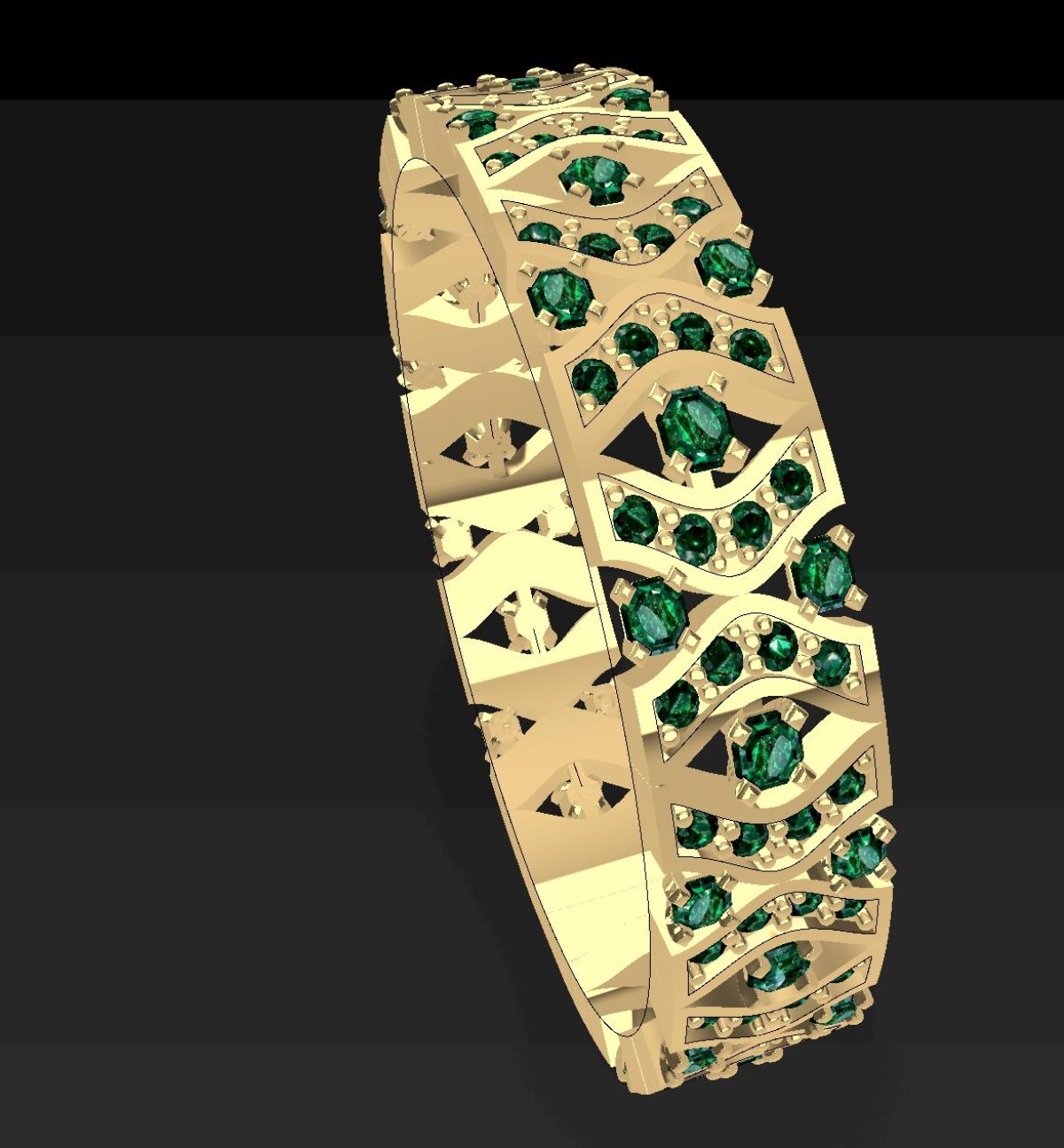 This elegant ring features a sophisticated geometric pattern enriched with vivid emerald-cut and round green stones, complemented by fine diamond accents. The design combines symmetry, depth, and refined ornamental elements, making it perfect for high-end jewelry manufacturing.