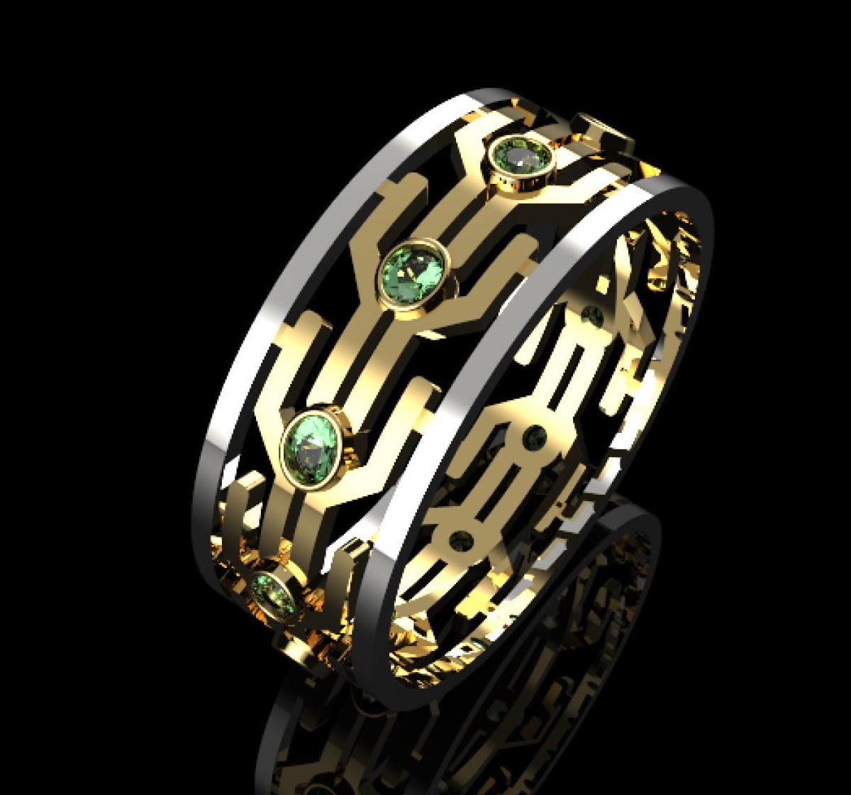 This elegant two-tone ring features a modern geometric openwork design crafted in polished yellow gold and contrasting white gold edges. The band is adorned with round brilliant-cut stones set in secure bezel settings, creating a refined balance between contemporary structure and timeless sparkle.