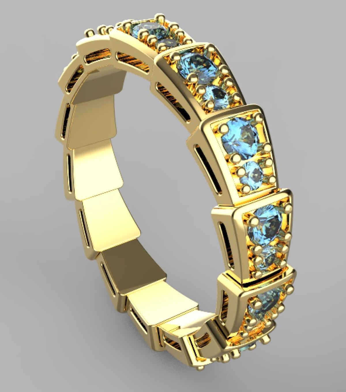 This elegant eternity ring features a modern segmented design with round blue gemstones securely set in polished gold frames. Each stone is evenly spaced and held with precise prongs to ensure durability and brilliance.