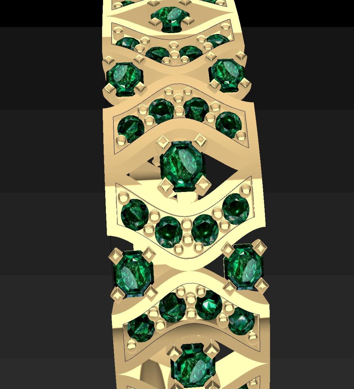 This elegant ring features a sophisticated geometric pattern enriched with vivid emerald-cut and round green stones, complemented by fine diamond accents. The design combines symmetry, depth, and refined ornamental elements, making it perfect for high-end jewelry manufacturing.