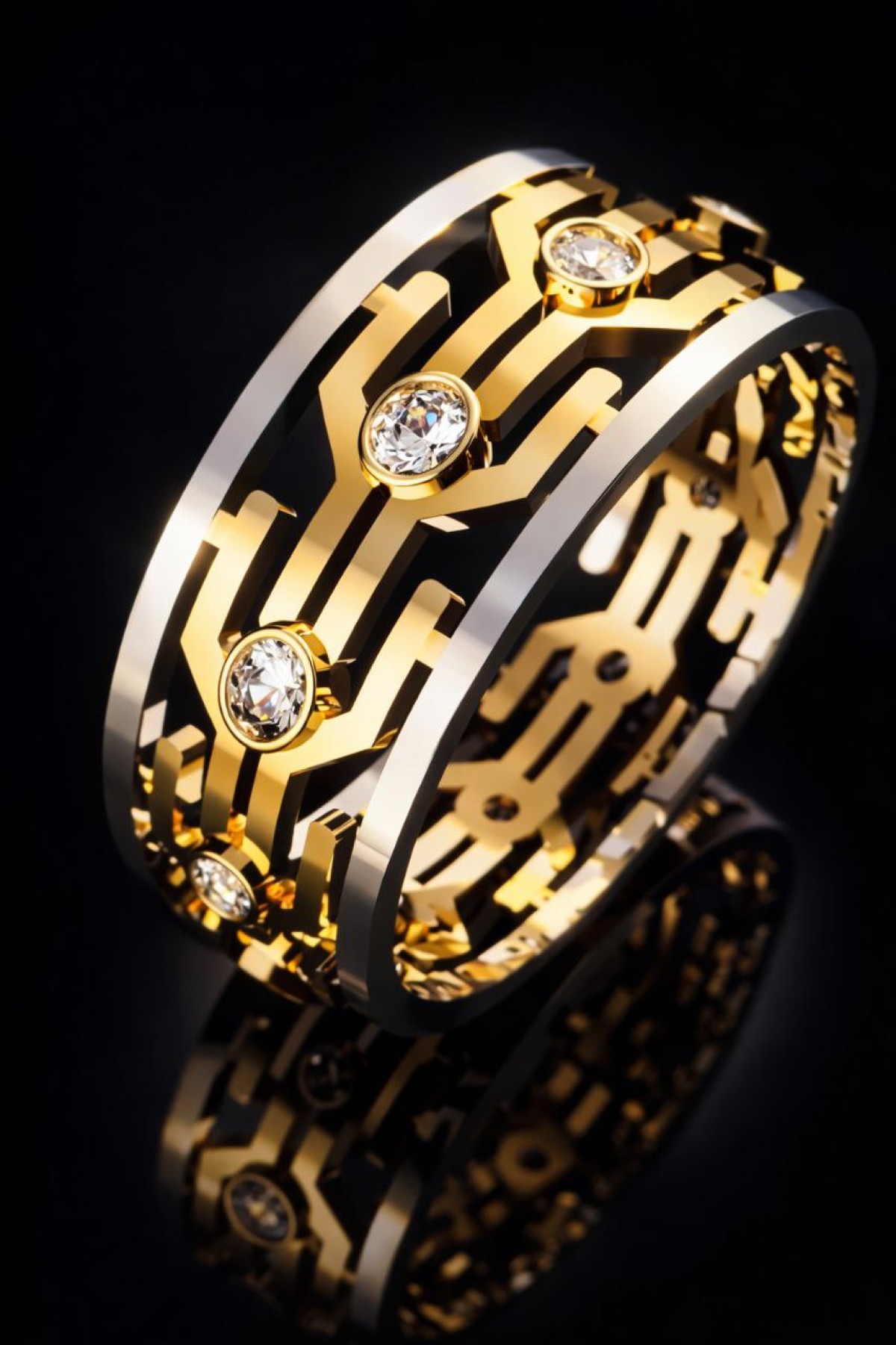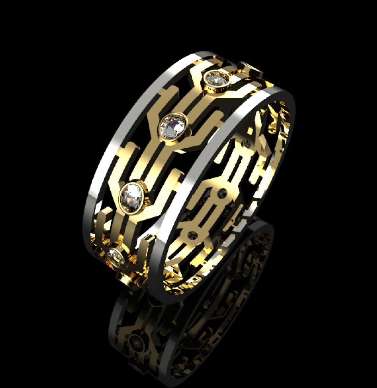 This elegant two-tone ring features a modern geometric openwork design crafted in polished yellow gold and contrasting white gold edges. The band is adorned with round brilliant-cut stones set in secure bezel settings, creating a refined balance between contemporary structure and timeless sparkle.