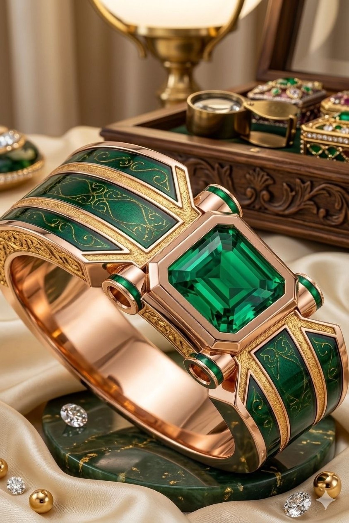 This exquisite ring design combines timeless elegance with a bold, modern aesthetic. Featuring a stunning emerald center stone set against rose gold and intricate green enamel detailing, it is a perfect blend of artistry and craftsmanship.